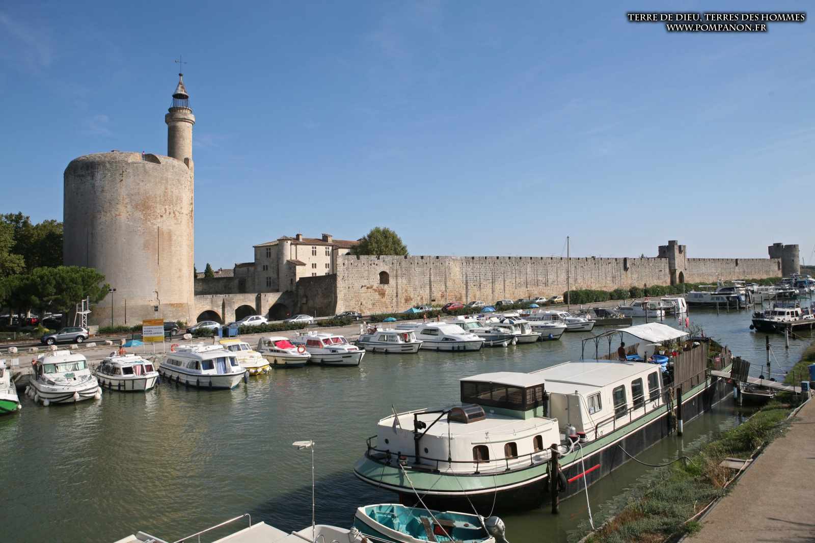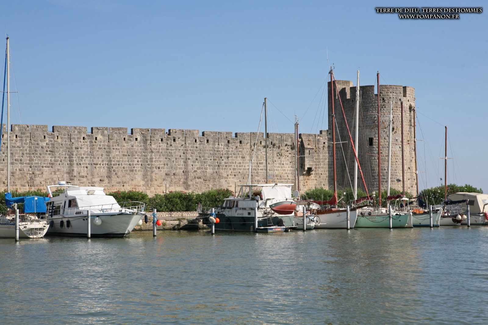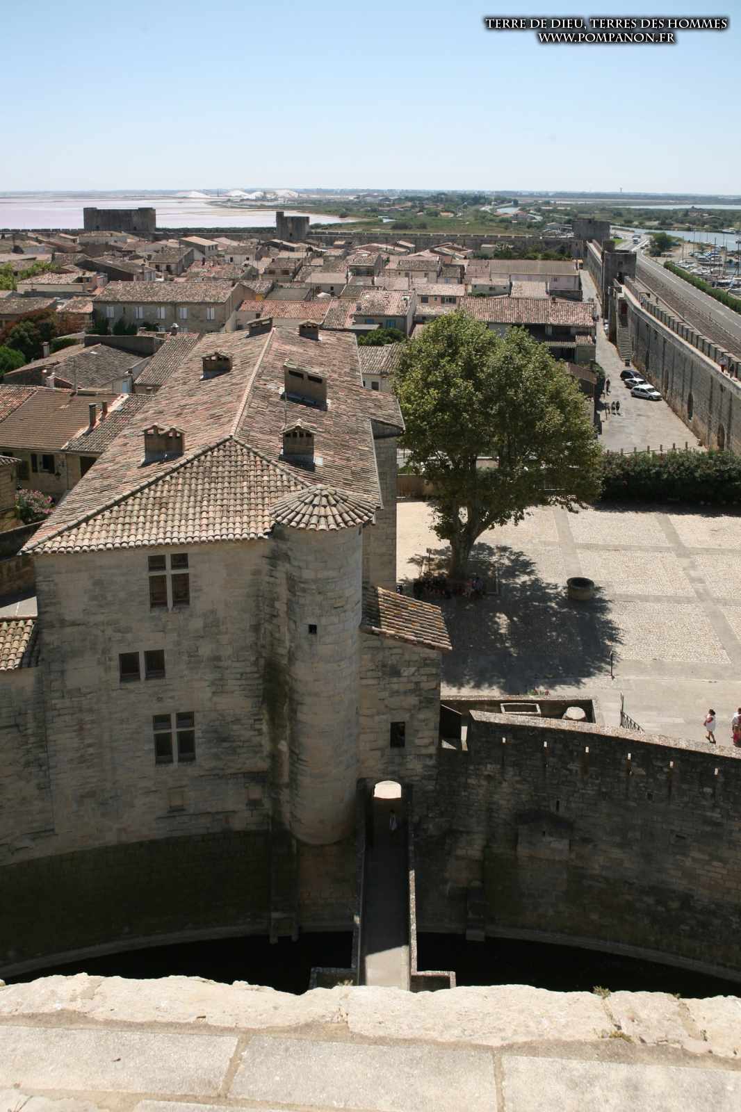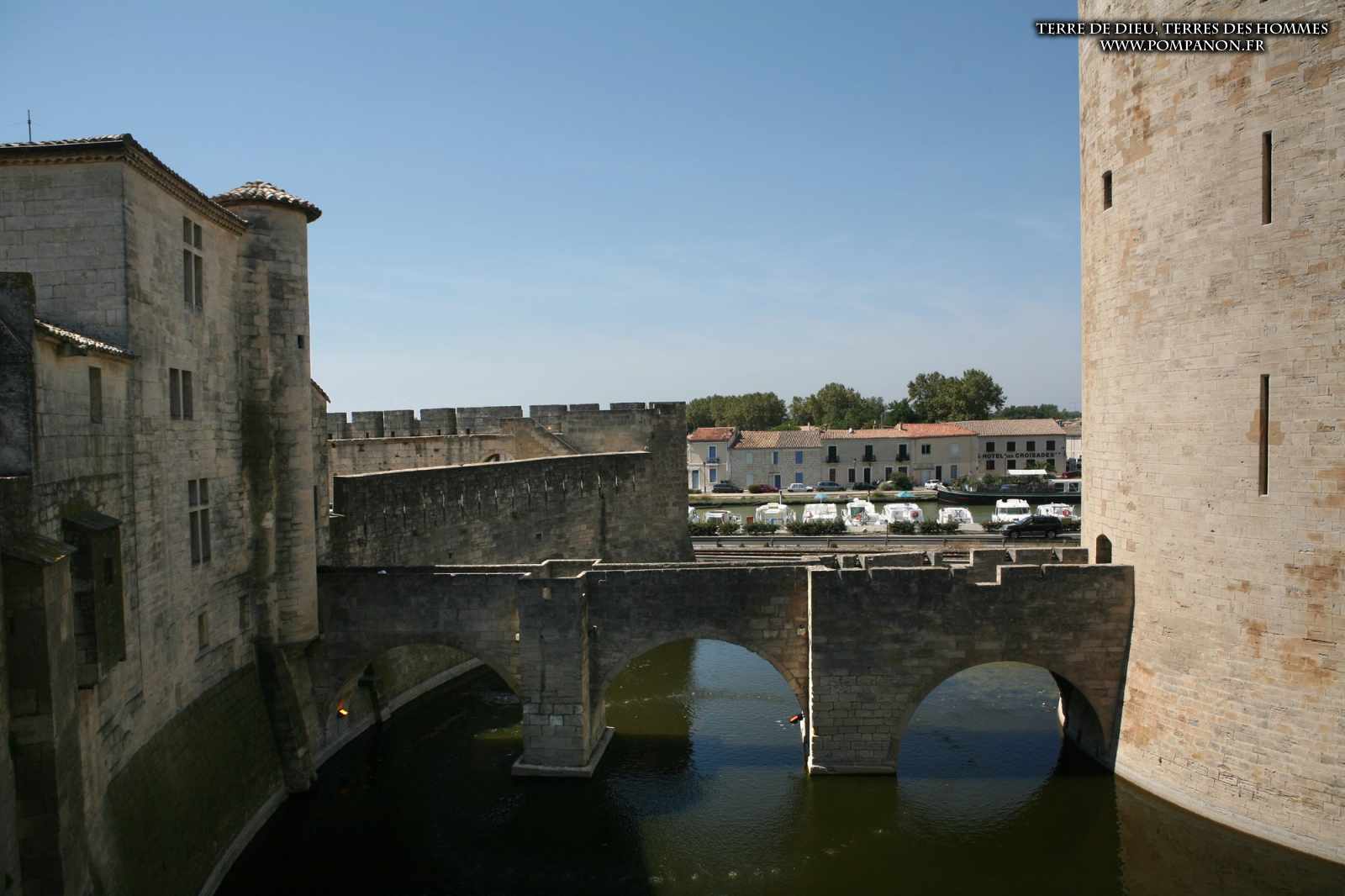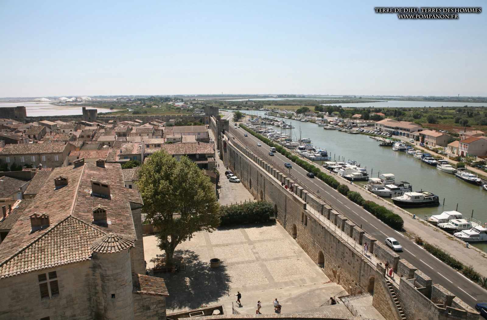 Photos de son rempart médiéval intact, construit par saint Louis au XIII°s, du donjon, des douves, des tours, des portes de la ville et de son port de plaisance.