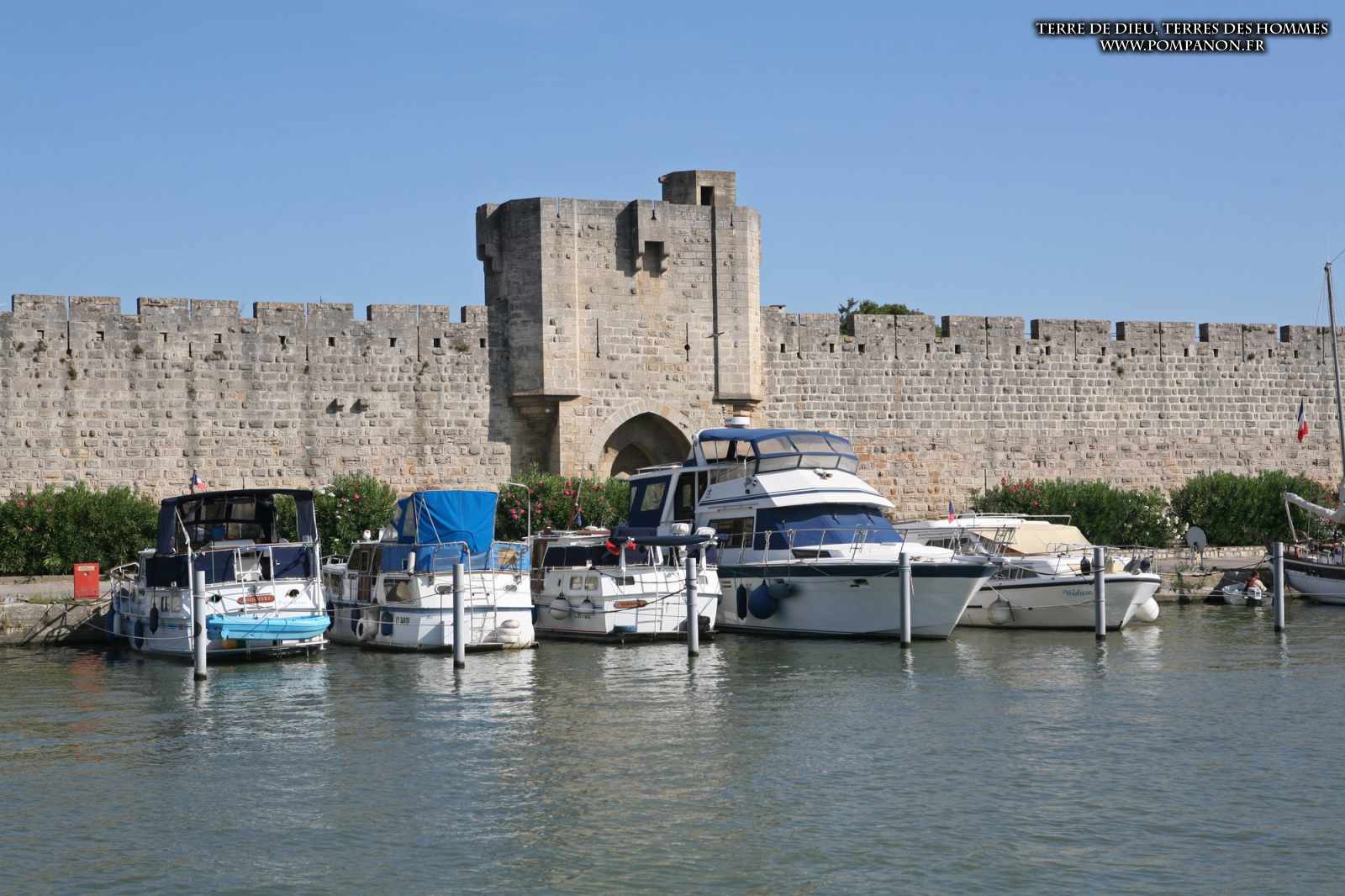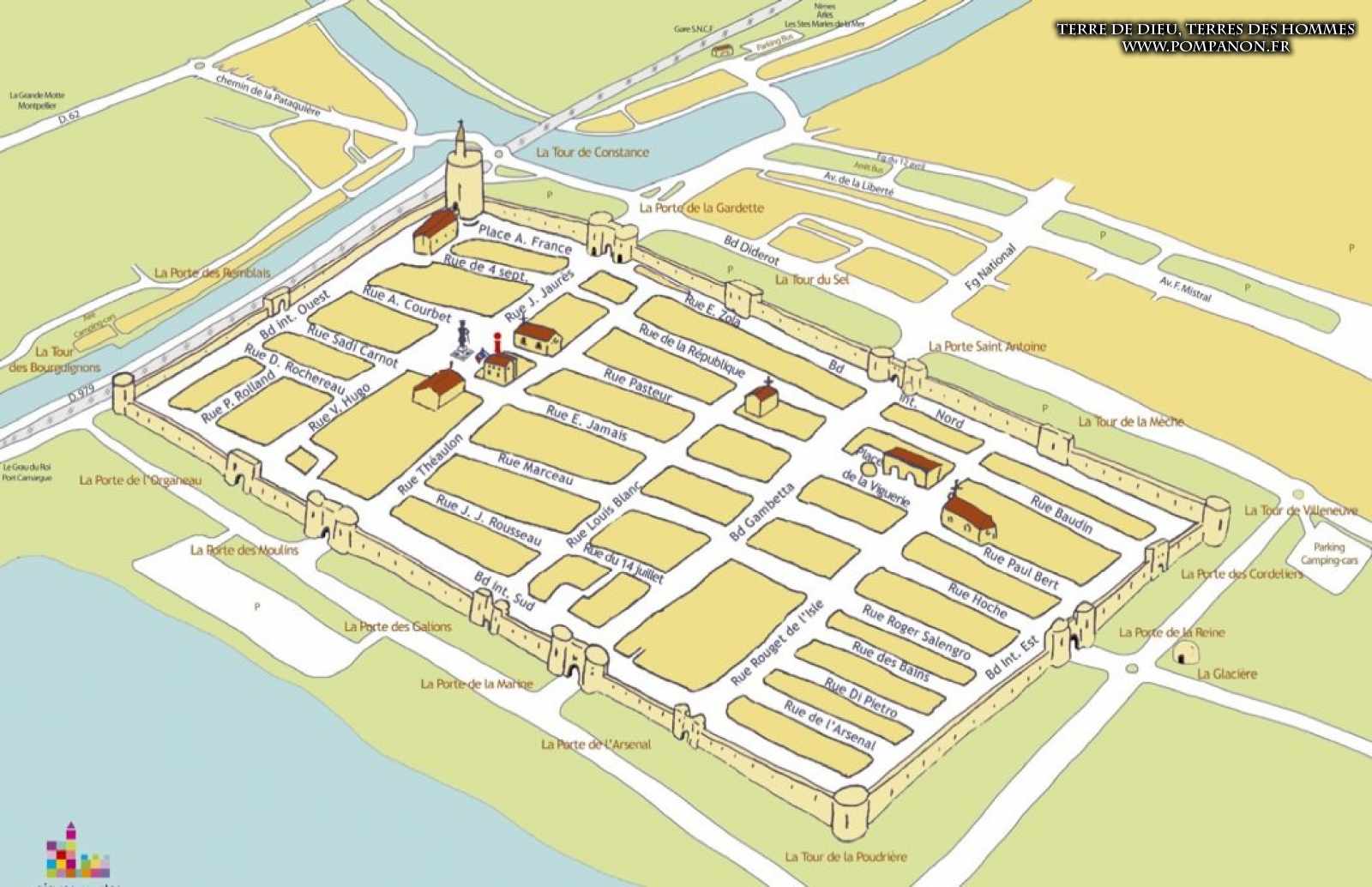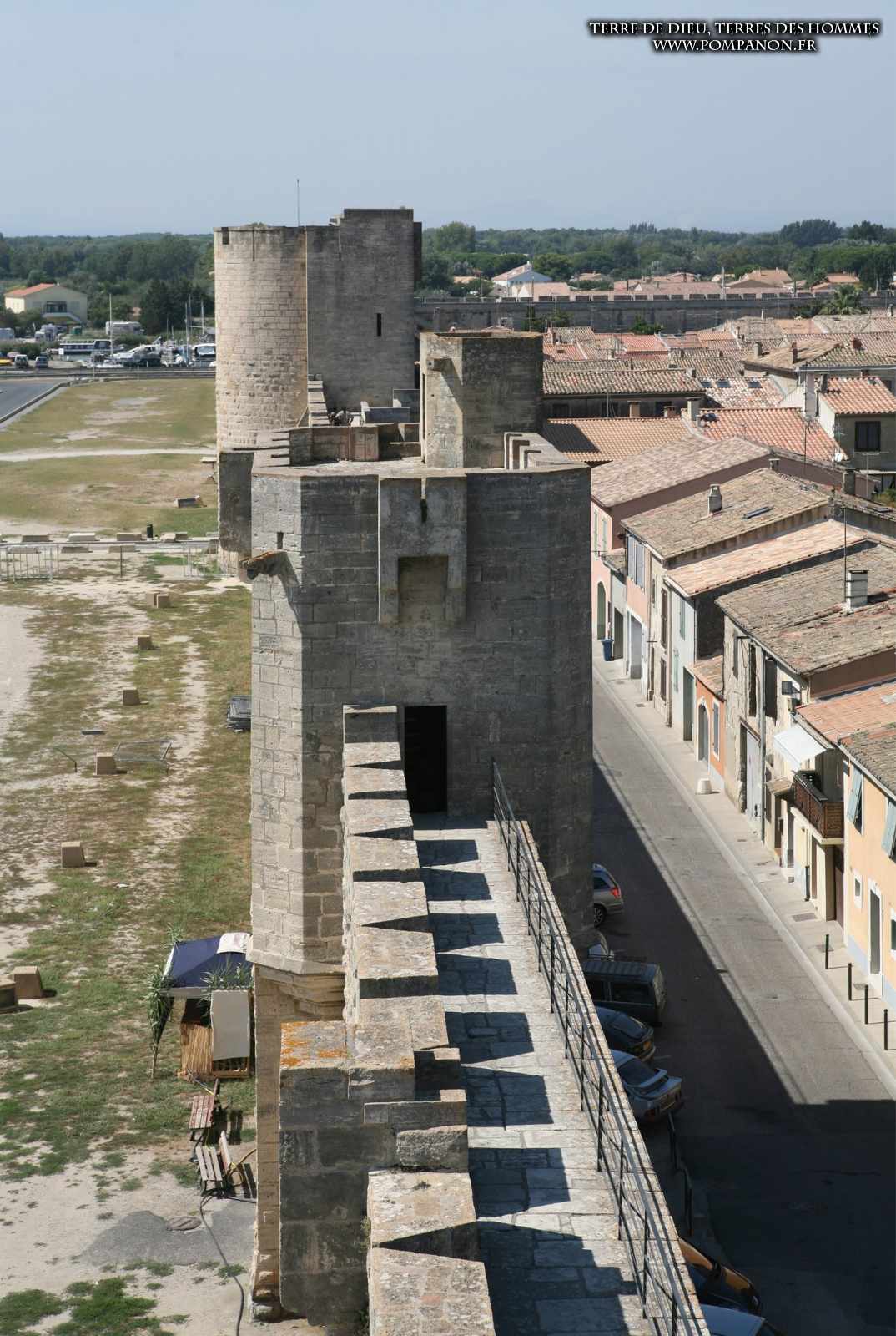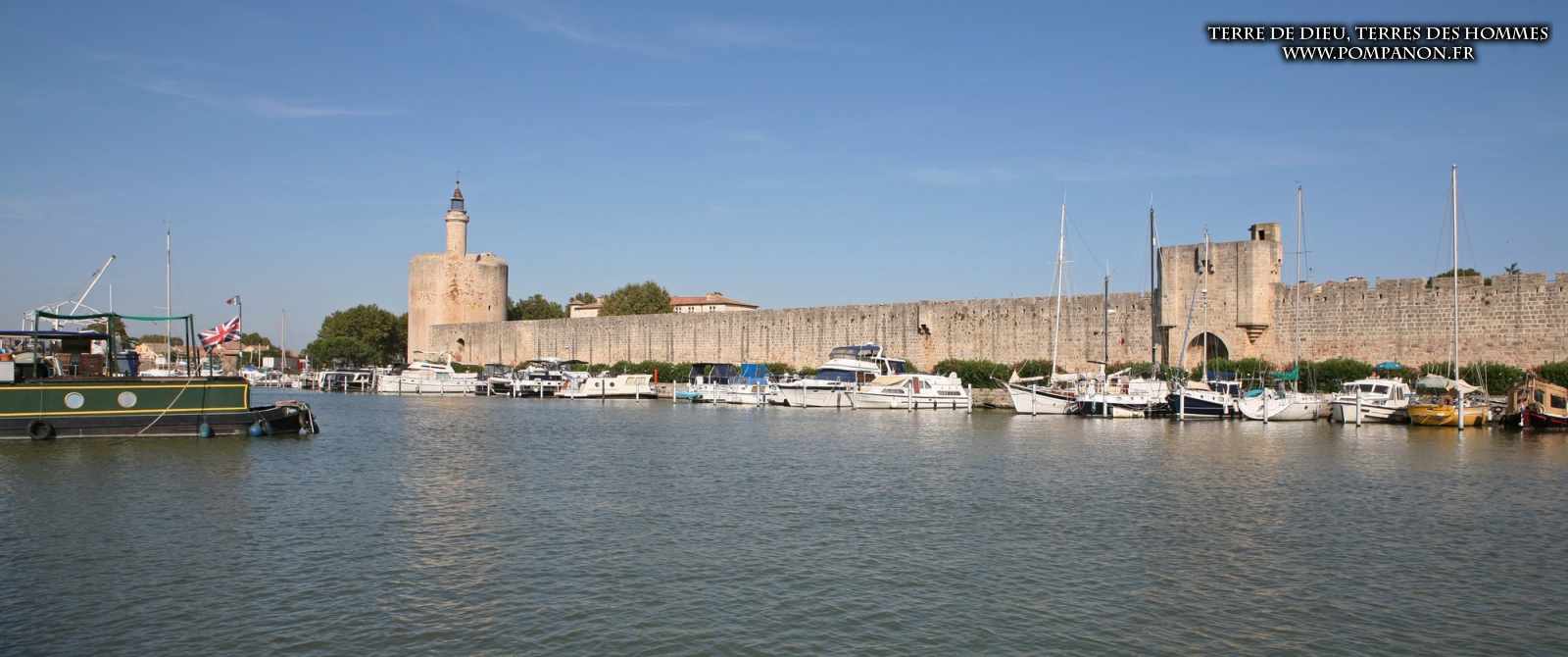 Photos de son rempart médiéval intact, construit par saint Louis au XIII°s, du donjon, des douves, des tours, des portes de la ville et de son port de plaisance.